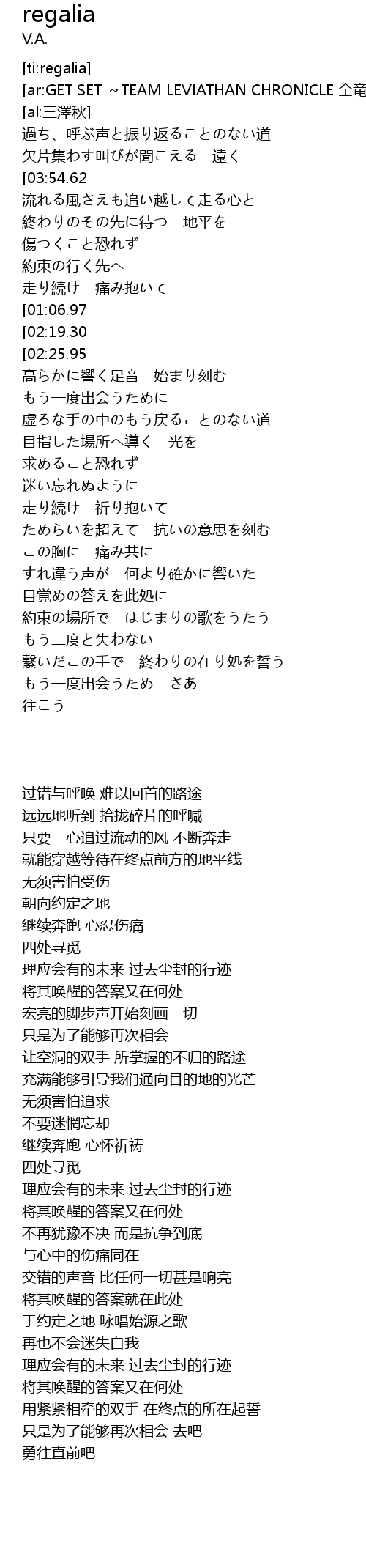 | [03:28.44][02:19.30][01:10.35] | 果たすべき未来(あす)を 閉ざされた過去の行方 |