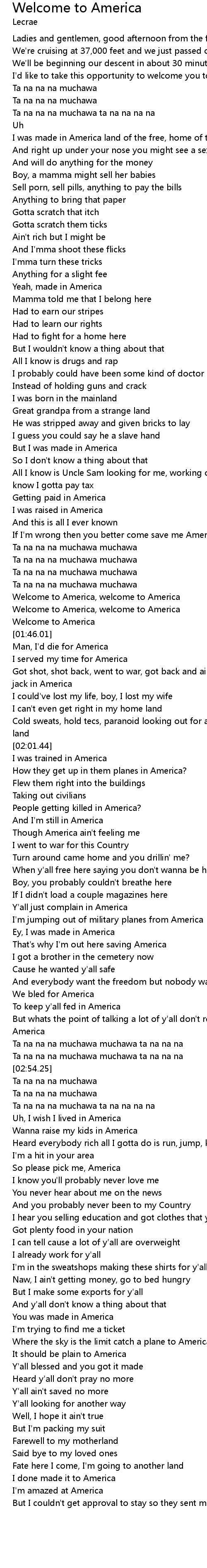 | [01:37.330] | Welcome to America, welcome to America |