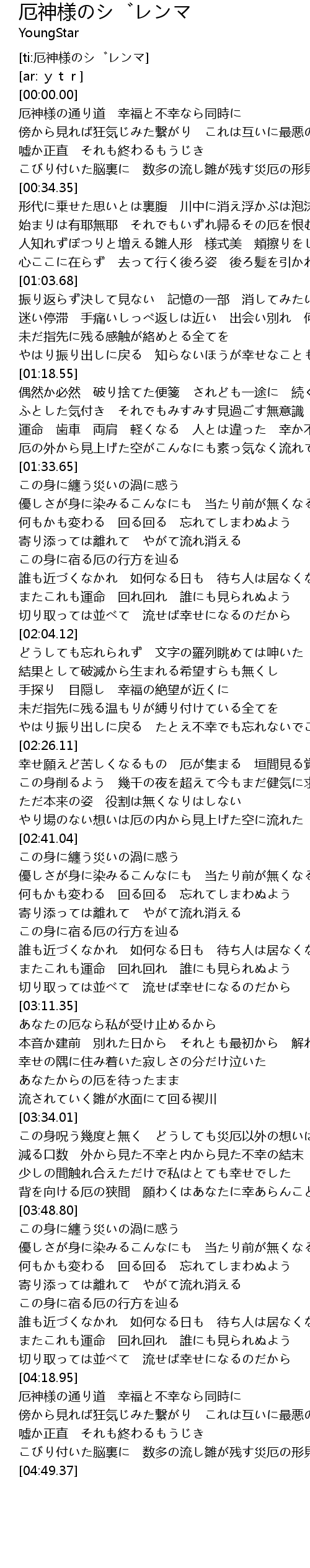 | [02:26.12] | 幸せ願えど苦しくなるもの 厄が集まる 垣間見る覚悟 |