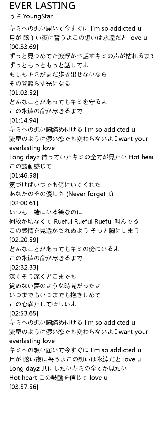 | [03:10.13] | 流星のように儚い恋でも変わらないよ I want your everlasting love |