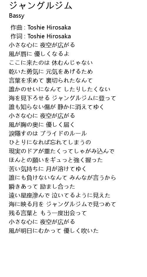 | [02:50.46] | 海に映る月を ジャングルジムで見つめて |