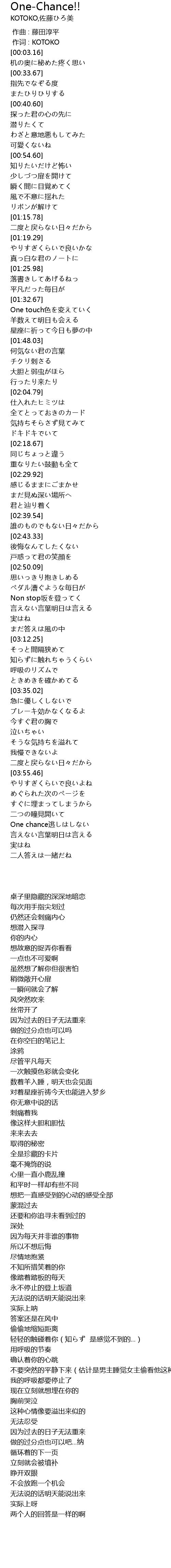 | [04:09.42] | One chance tao |