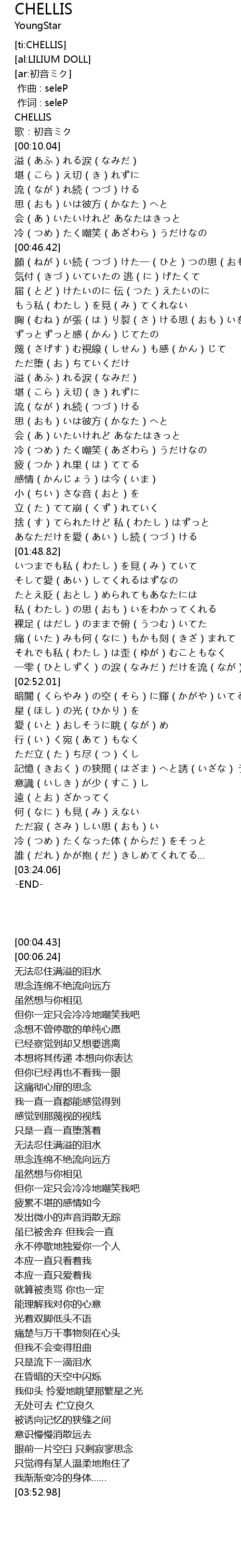 | [02:56.55] | 星(ほし)の光(ひかり)を 愛(いと)おしそうに眺(なが)め |