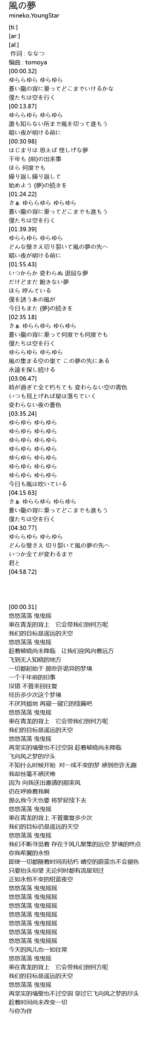| [04:34.06] | どんな壁さえ 切り裂いて風の夢の先へ |