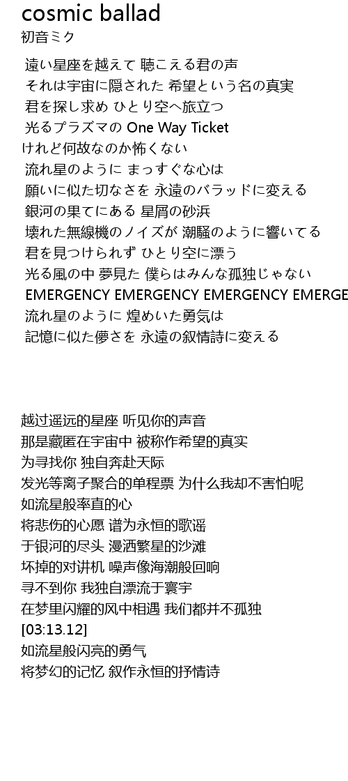 | [01:06.17] | 光るプラズマの One Way Ticket けれど何故なのか怖くない |