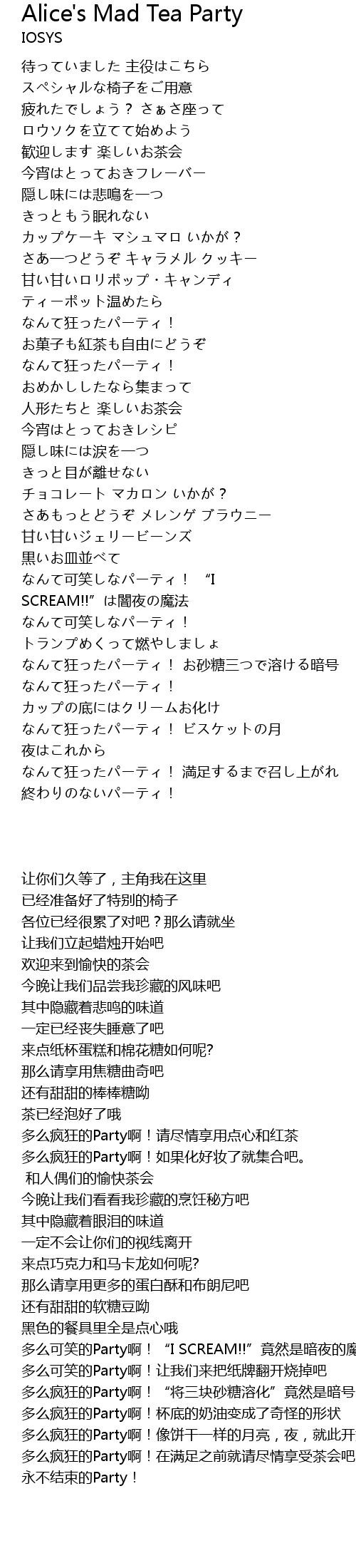 | [01:14.000] | なんて狂ったパーティ! お菓子も紅茶も自由にどうぞ |