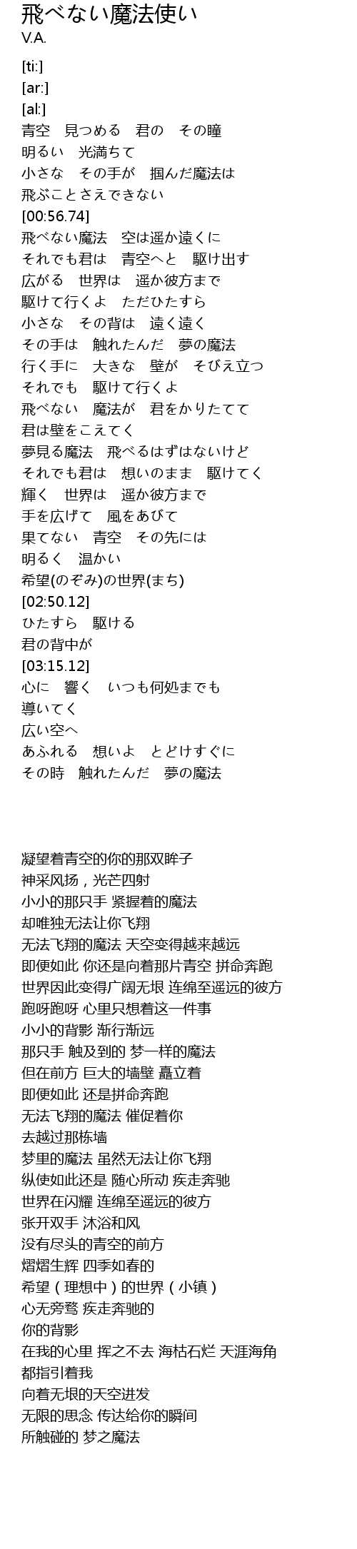 | [00:57.14] | 飛べない魔法 空は遥か遠くに |