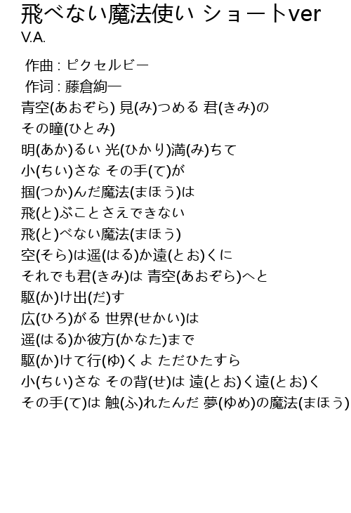 | [00:56.59] | 飛(と)べない魔法(まほう) 空(そら)は遥(はる)か遠(とお)くに |