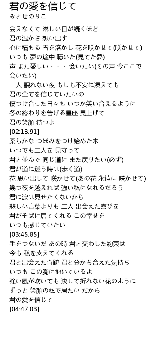 | [04:13.36] | 君と出会えた奇跡 君と分かち合えた気持ち |
