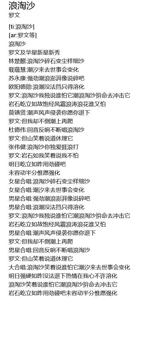 | [00:32.129] | 罗文:浪淘沙我独说谁怕它潮浪淘沙拚命去冲击它 |