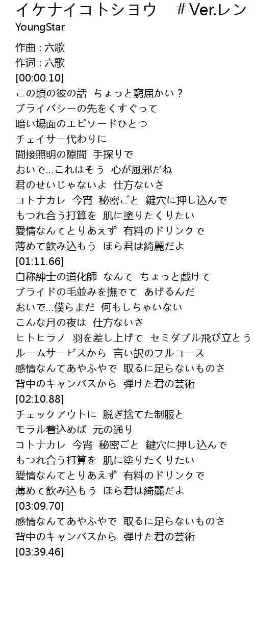 | [00:48.02] | コトナカレ 今宵 秘密ごと 鍵穴に押し込んで |