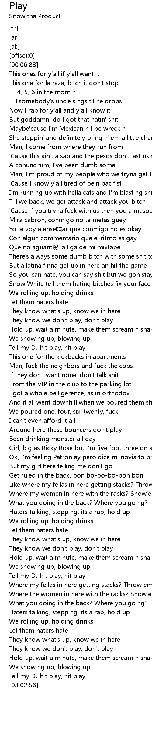 | [00:15.10] | This one for la raza, bitch it don't stop |