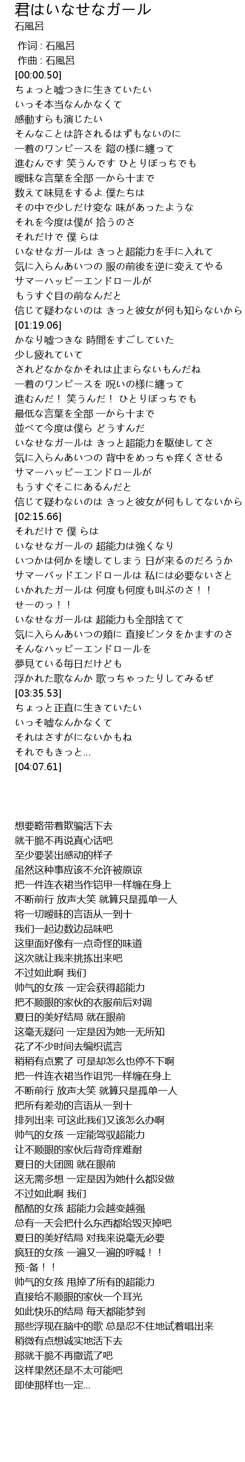 | [01:00.69] | いなせなガールは きっと超能力を手に入れて |