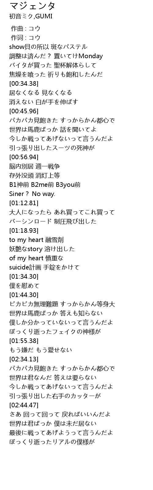 | [01:27.56] | suicide計画 手錠をかけて |