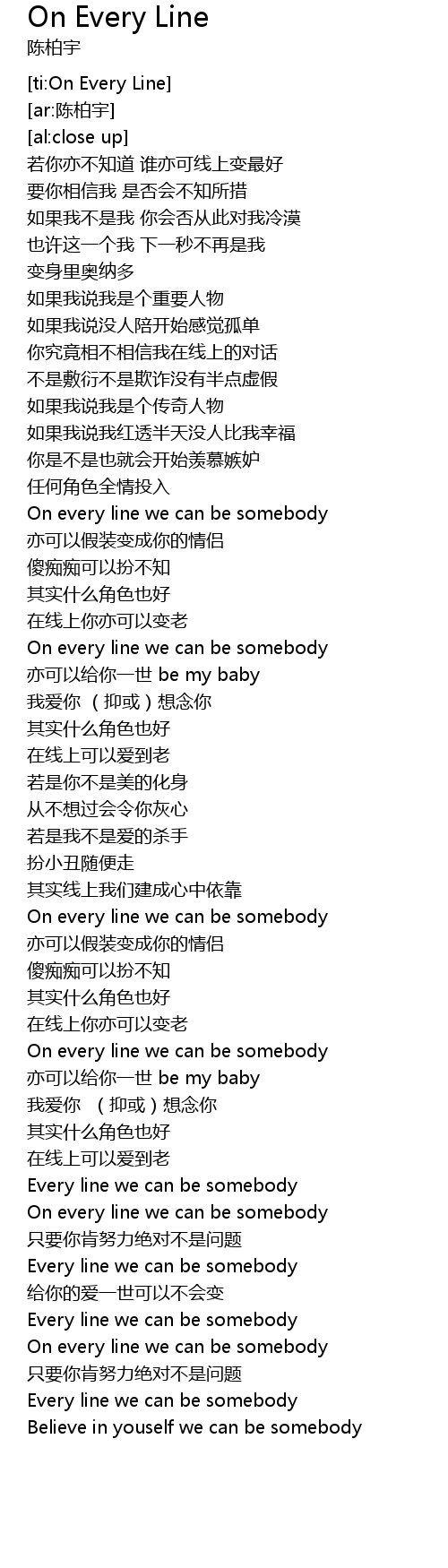 | [00:22.02] | ruò nǐ yì bù zhī dào shuí yì kě xiàn shàng biàn zuì hǎo |