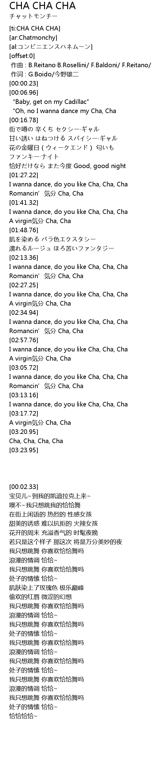| [02:59.19] | I wanna dance, do you like Cha, Cha, Cha |