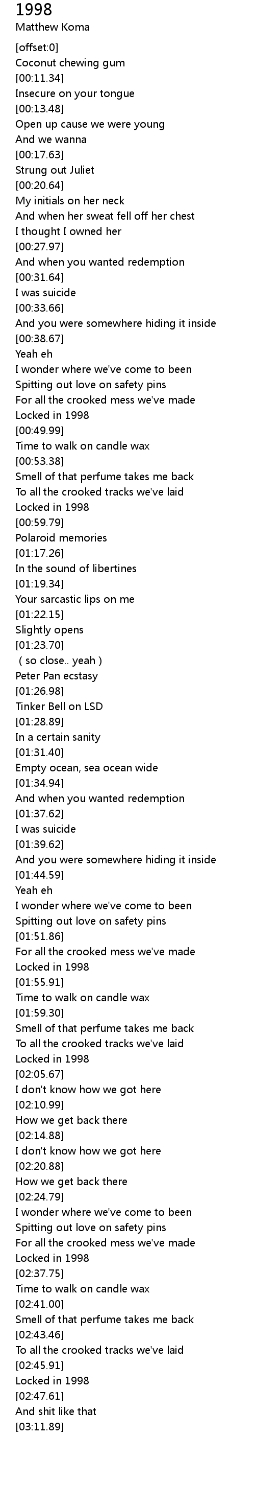 | [02:02.38] | To all the crooked tracks we' ve laid |
