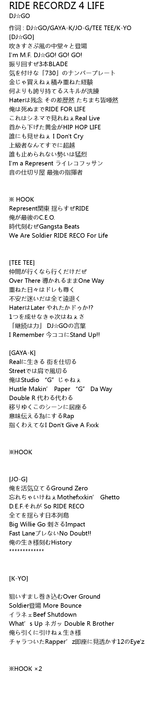 | 作词 : DJ☆GO/GAYA-K/JO-G/TEE TEE/K-YO | |