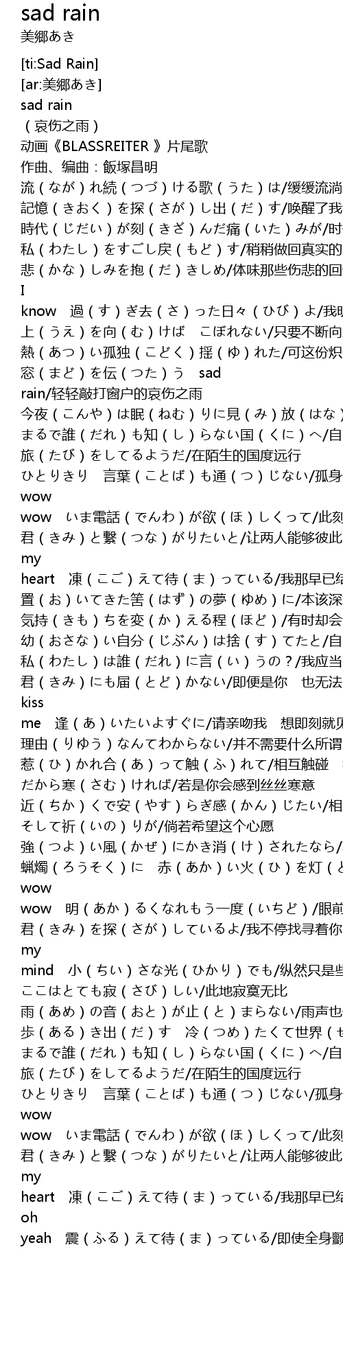 | [01:09.501] | 窓(まど)を伝(つた)う sad rain/轻轻敲打窗户的哀伤之雨 |