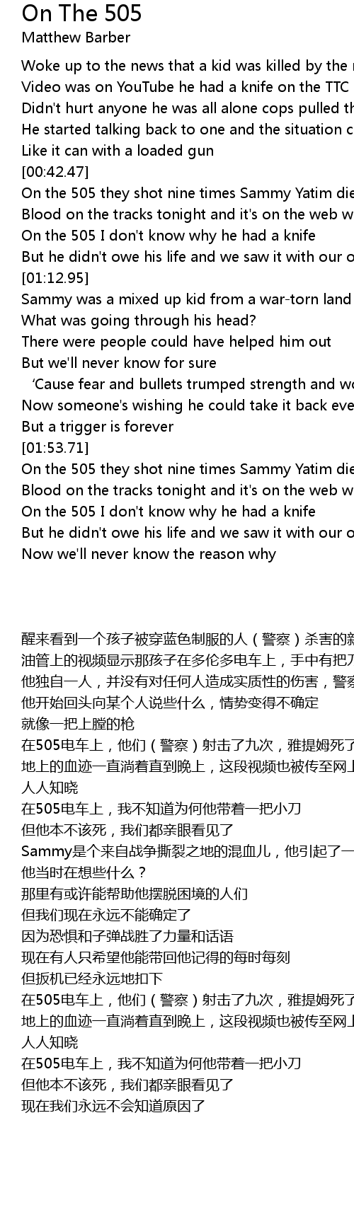 | [01:55.95] | On the 505 they shot nine times Sammy Yatim died |