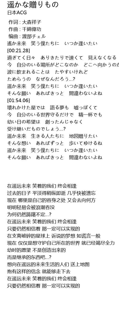 | [00:01.18] | 遙か未来 笑う僕たちに いつか逢いたい |