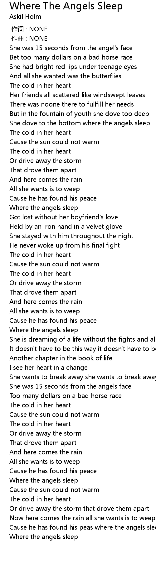 | [02:23.60] | Where the angels sleep |