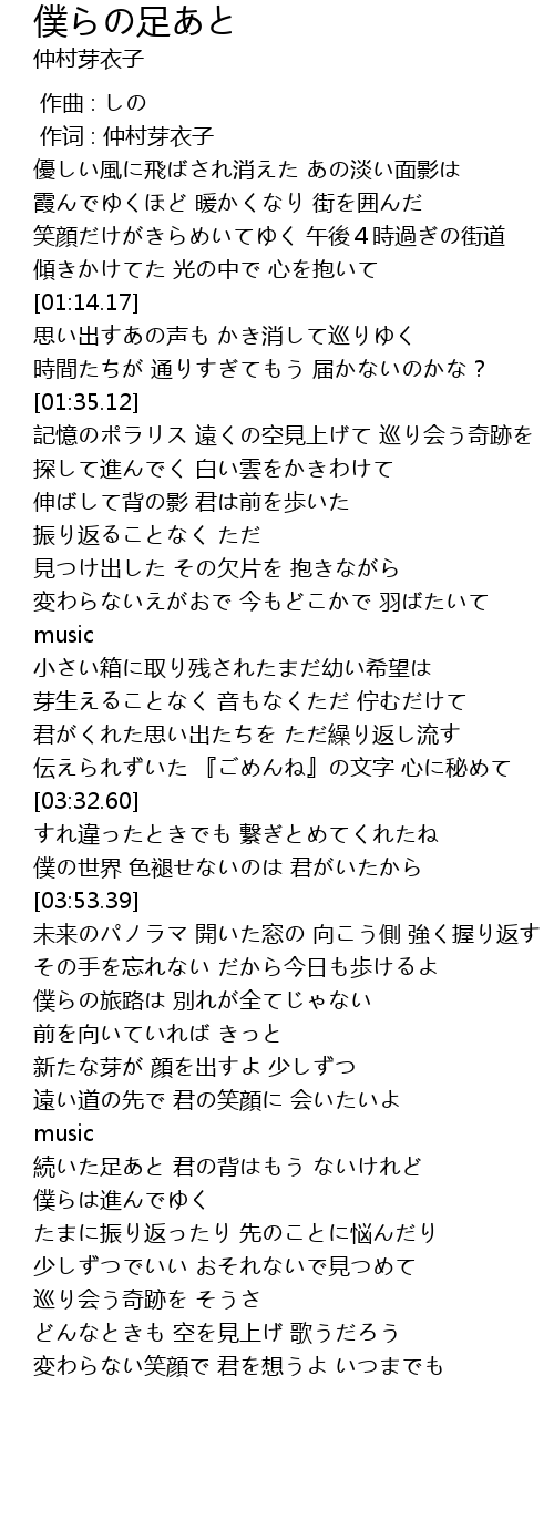 | [05:15.10] | 続いた足あと 君の背はもう ないけれど 僕らは進んでゆく |