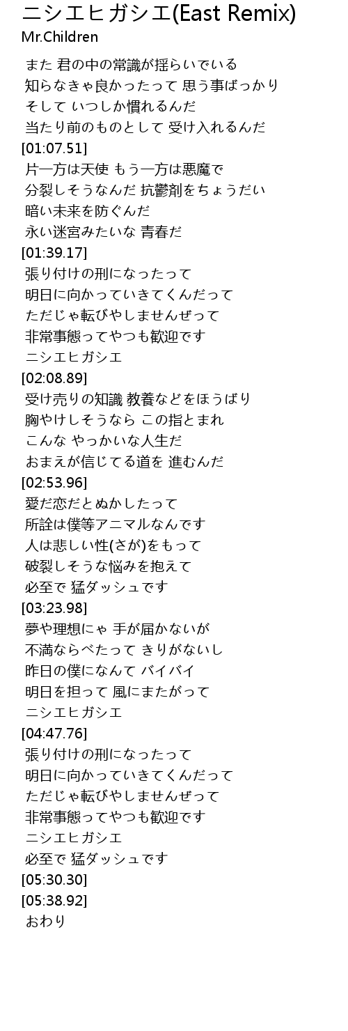 | [05:24.89] | ニシエヒガシエ |