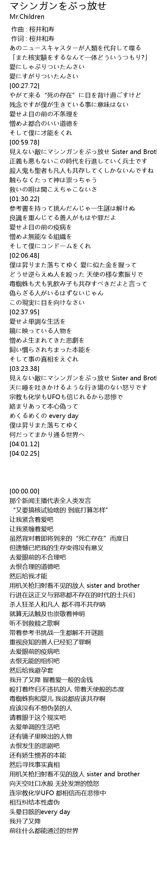 | [03:23.94] | 見えない敵にマシンガンをぶっ放せ Sister and Brother |