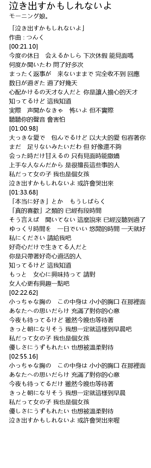 | [01:29.08] | 泣き出すかもしれないよ 或許會哭出來 |