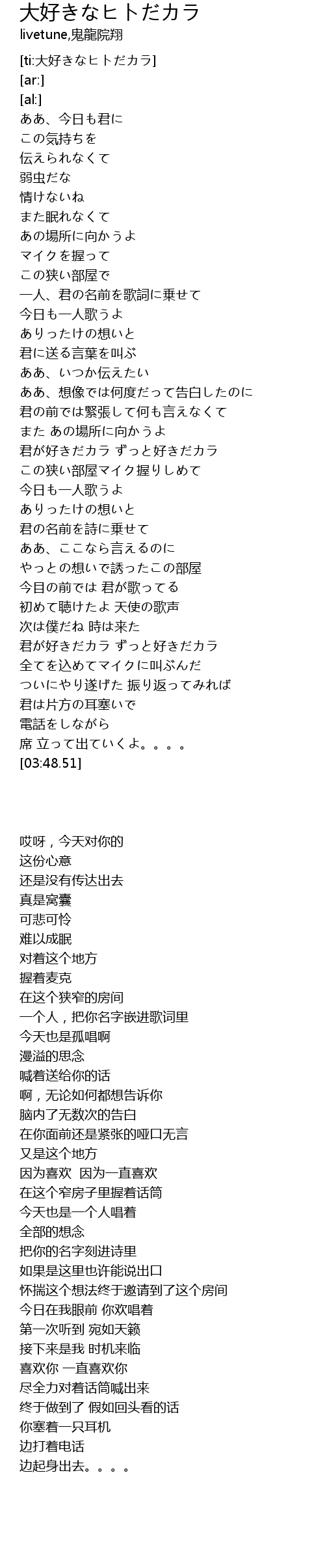 | [01:50.84] | 君が好きだカラ ずっと好きだカラ |