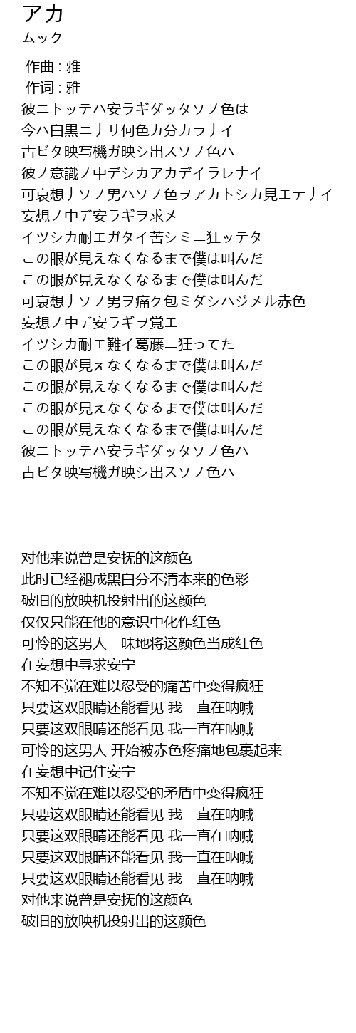 | [01:42.81] | 可哀想ナソノ男ハソノ色ヲアカトシカ見エテナイ |