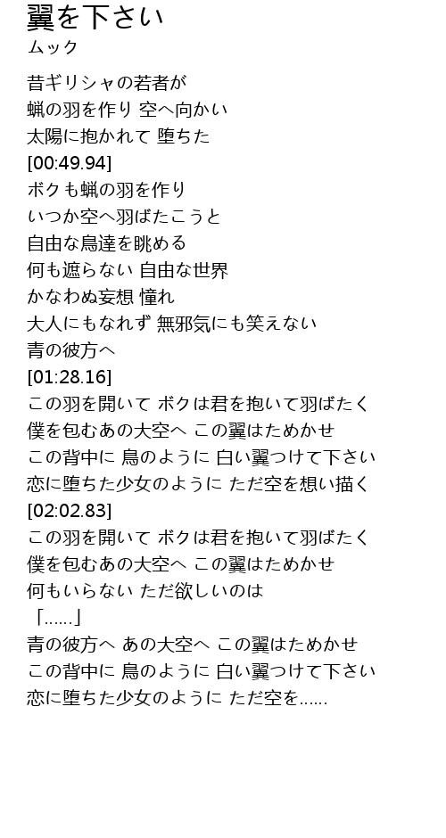 | [00:34.54] | 蝋の羽を作り 空へ向かい |