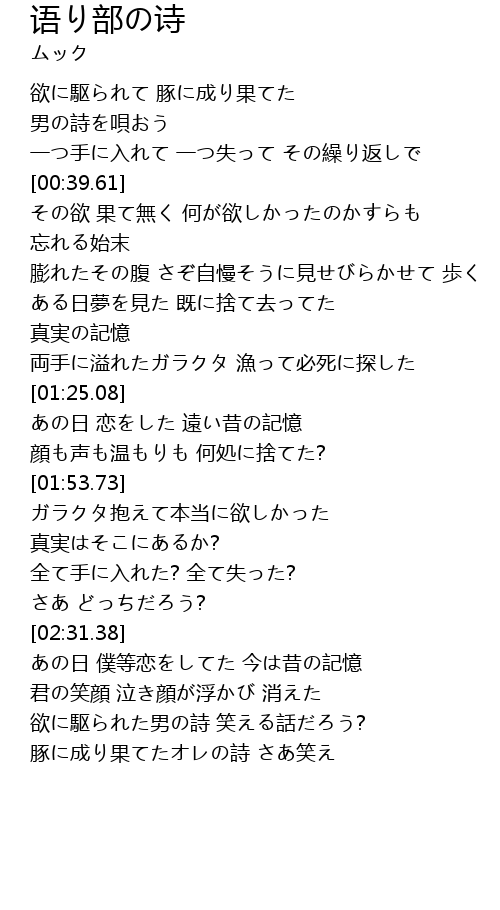 | [03:06.87] | 豚に成り果てたオレの詩 さあ笑え |