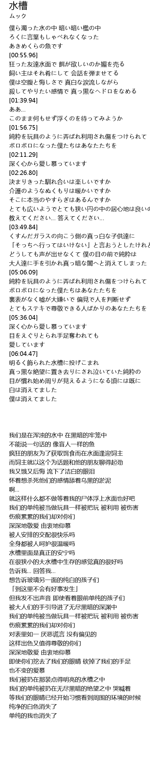 | [00:38.89] | 僕ら濁った水の中 暗い暗い檻の中 |