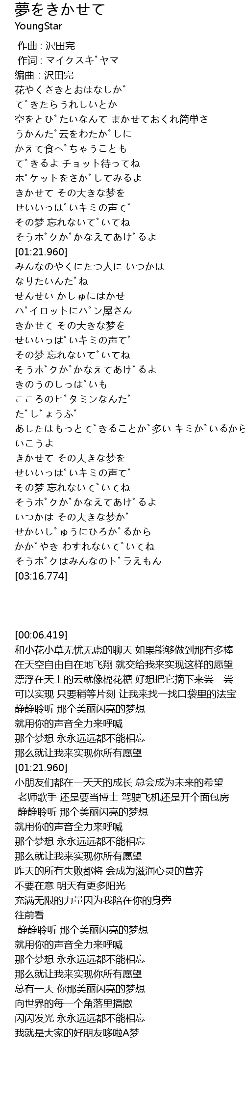 | [02:35.634] | きかせて その大きな梦を せいいっぱいキミの声で |