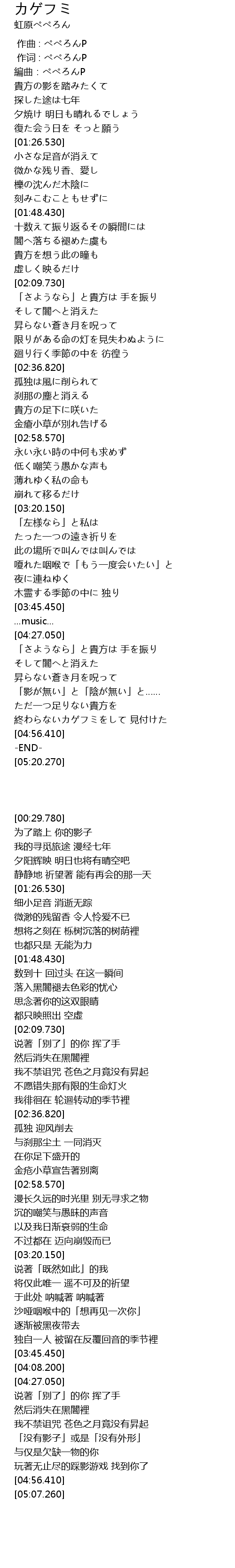 | [04:46.510] | 終わらないカゲフミをして 見付けた |