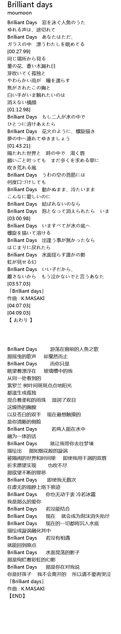| [03:30.04] | Brilliant Days 水面揺らす誰かの影 |