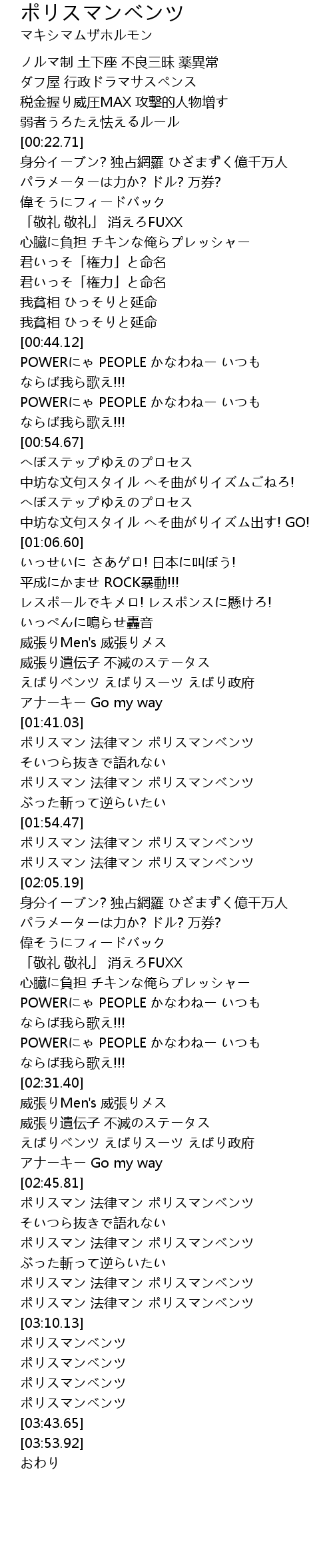 | [01:41.91] | ポリスマン 法律マン ポリスマンベンツ |