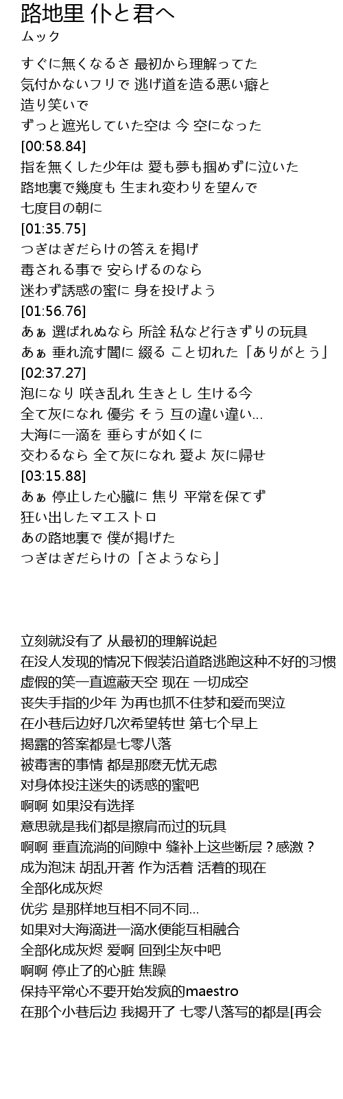 | [03:35.10] | あの路地裏で 僕が掲げた つぎはぎだらけの「さようなら」 |