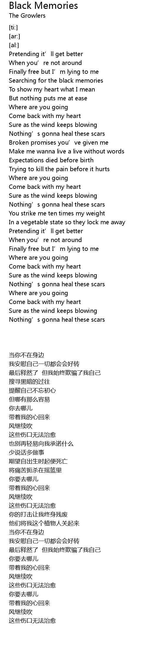 | [01:36.91] | Nothing’s gonna heal these scars |