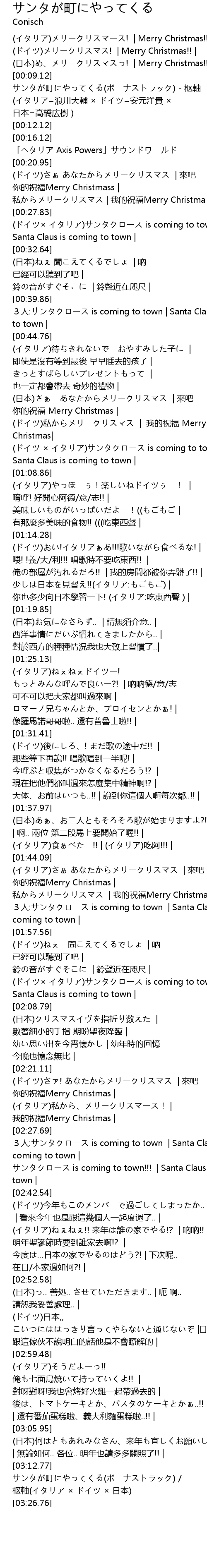 | [02:04.07] | (ドイツ× イタリア)サンタクロース is coming to town | Santa Claus is coming to town | |