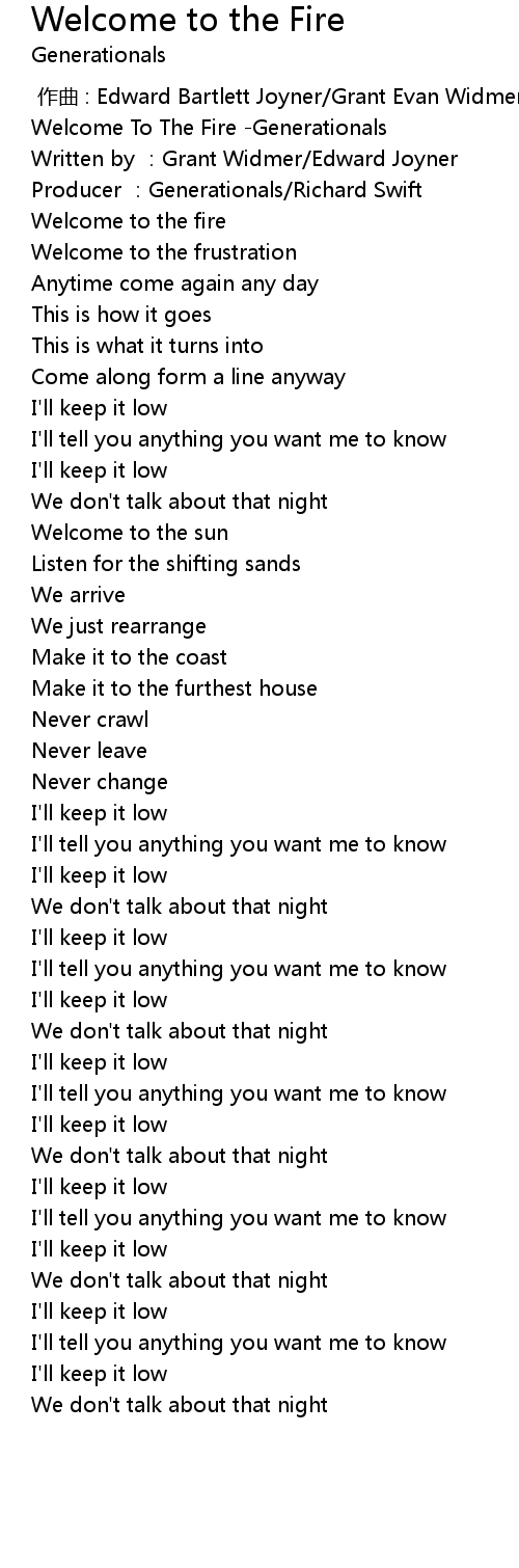 | [00:00.102] | Welcome To The Fire -Generationals |