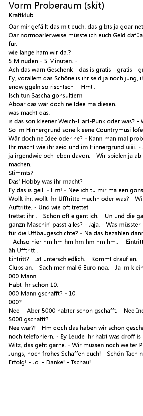 | trettet ihr . Schon oft eigentlich. Un und die ganze LogigLogistik mit eure ganzn Maschin' passt alles? Jaja. Was mü sster bezahln un so beim Ufftritt fü r die Uffbaugeschichte? Na das bezahlen dann meistens die wo wir auftreten. Achso hier hm hm hm hm hm hm hm... Eintritt. Was wollt ihr habn die Stunde h Ufftritt . | |