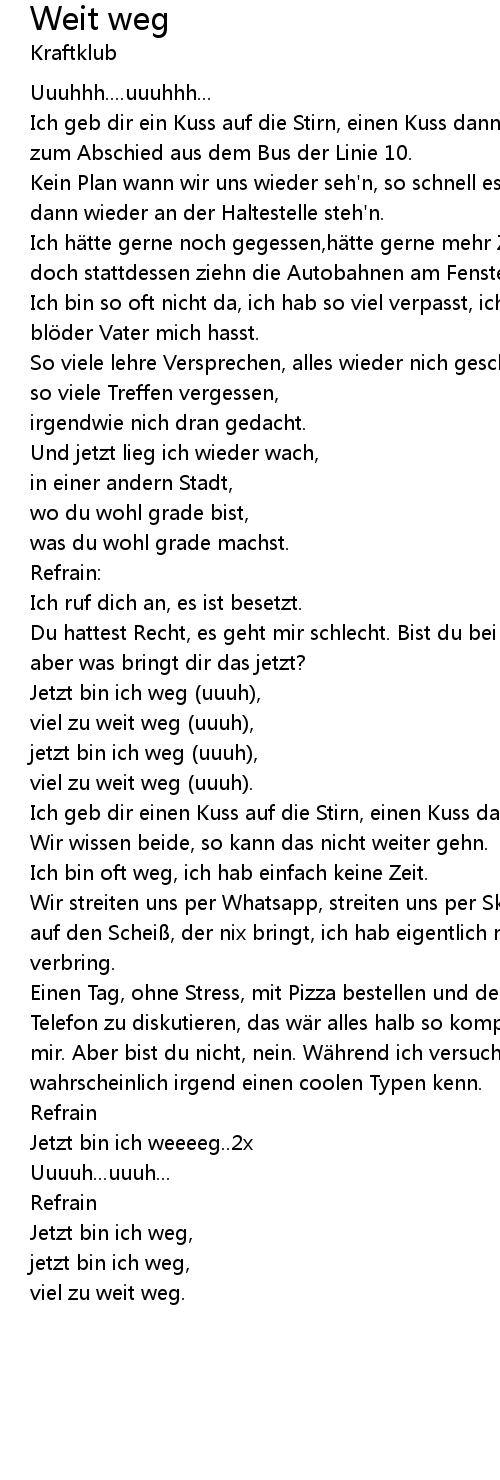 | Kein Plan wann wir uns wieder seh' n, so schnell es geht bin ich bei dir, bis wir dann wieder an der Haltestelle steh' n. | |