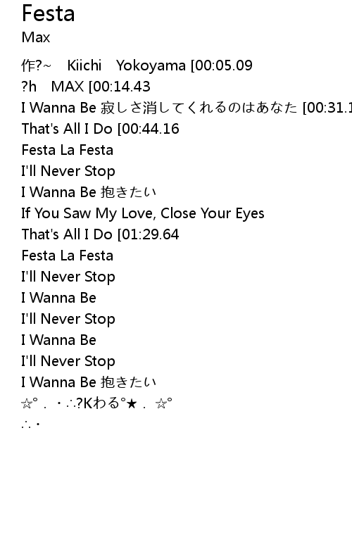 | [00:00.82]作?~ Kiichi Yokoyama [00:05.09]作曲 Kiichi Yokoyama [00:09.37]?h MAX [00:14.43]I'll Never Stop 乾いた胸をよぎる昨日 [00:21.68]I Wanna Be 寂しさ消してくれるのはあなた [00:31.13]If You Saw My Love, Close Your Eyes [00:38.48]That's All I Do [00:44.16]Festa La Festa 海岸を??る火が?eれながら [00:51.46]Festa La Festa 眠らない夜に溶けてく [00:59.91]I'll Never Stop ?bかな常夏の??国で [01:07.08]I Wanna Be 抱きたい 全てが消えないうちに [01:16.59]If You Saw My Love, Close Your Eyes [01:23.86]That's All I Do [01:29.64]Festa La Festa 少しだけ日??けした横??に [01:36.86]Festa La Festa 原色の蝶がたわむれ [01:45.38]I'll Never Stop ?垡酝猡膝攻畅`ルで流して [01:52.57]I Wanna Be 掴んだ新しい明日の?椁? [02:33.44]I'll Never Stop 乾いた胸をよぎる昨日 [02:40.77]I Wanna Be 寂しさ消してくれるのはあなた [02:48.22]I'll Never Stop ?bかな常夏の??国で [02:55.24]I Wanna Be 抱きたい 全てが消えないうちに [03:28.10] | ☆°.・∴?Kわる°★. ☆° ∴・ |