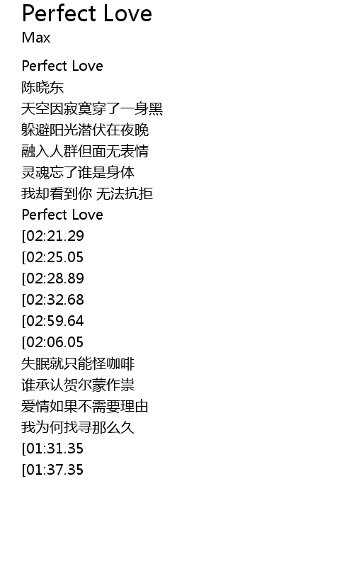 | [03:08.08][02:59.64][02:52.14][01:54.60][01:04.55] | your perfect love |