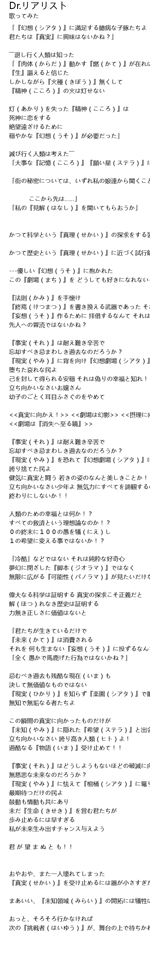 | 「大事な『記憶(こころ)』『願い星(ステラ)』に預け『幻想(うそ)』に逃げるシステムを」 | |