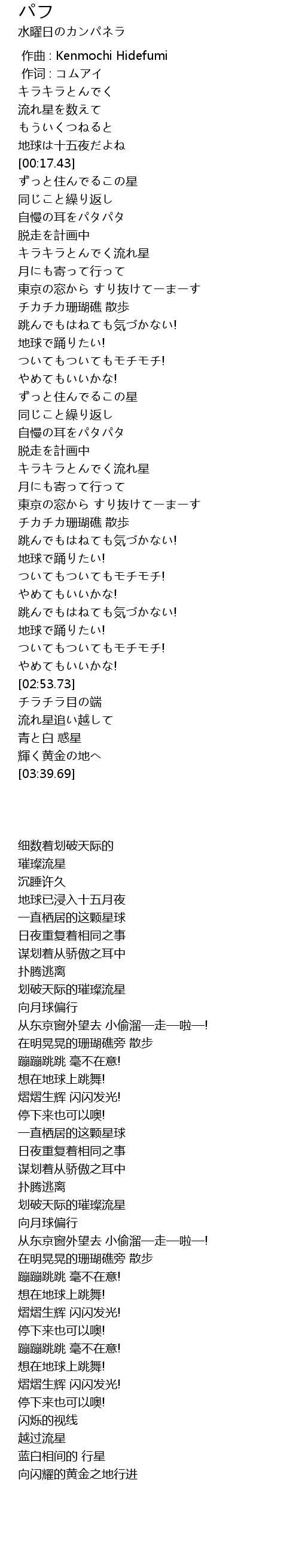 | [00:58.64] | キラキラとんでく流れ星 |