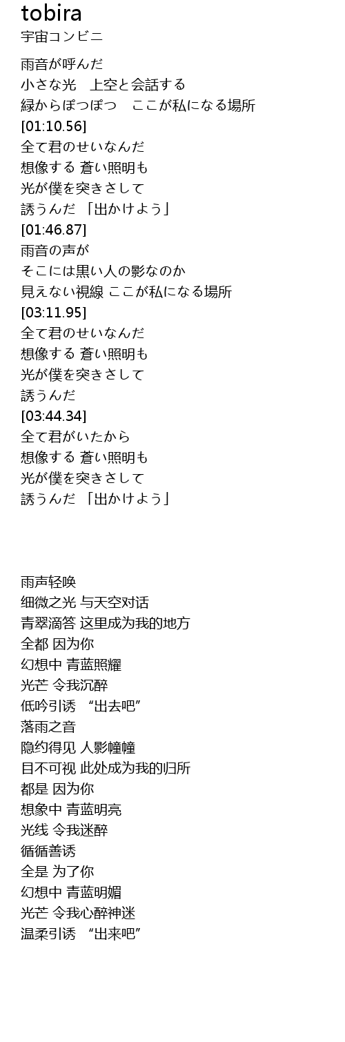 | [00:55.59] | 緑からぽつぽつ ここが私になる場所 |